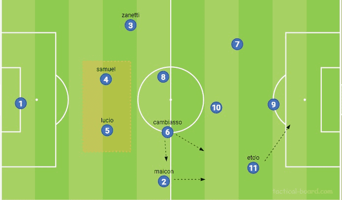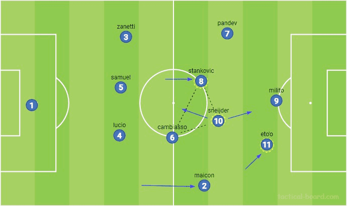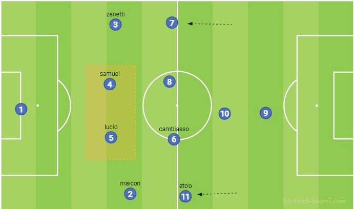 오른쪽의 마이콘은 래프트백 파트너보다 더 폭넓게 움직였고, 더 공격적으로 존재감을 보였다. 이러한 플레이가 작동하기 위해서, 무리뉴는 캄비아소의 우수한 게임 리딩에 의존했다. 이 아르헨티나 미드필더는 커버 플레이를 위해 후방이나 옆 사이드 공간으로 움직일 수 있었고, 그러면서 밀리토를 지원하기위해 필드 안쪽으로 이동하는 에투의 뒤로 마이콘이 전진할 수 있었다.