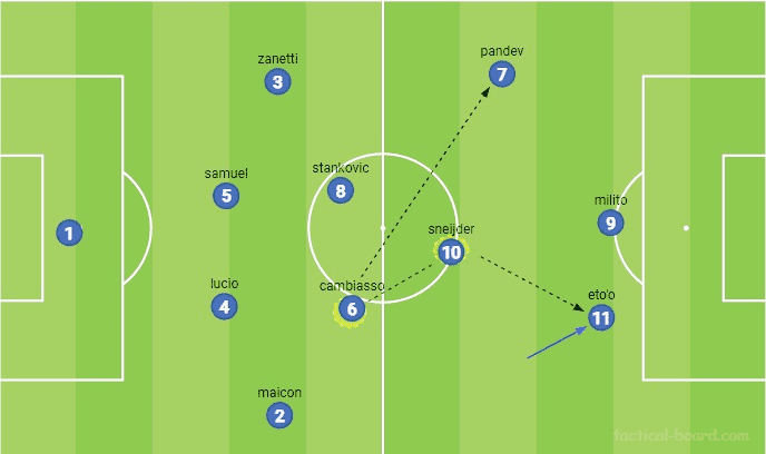인터밀란은 10번 스네이더의 창조성과 시야, 캄비아소의 롱패스, 그리고 디에고 밀리토의 기회를 포착하는 능력에 의존하면서, 깊게 내려섰고, 역습했다. 일단 볼탈취를 성공하면, 캄비아소나 스네이더에게 보내고, 그리고나면 깊은 지역으로부터 측면으로 향하는 롱패스로 공격하거나, 밀리토나 에투에게 연결하는 10번 더치맨의 능력을 활용하면서 공격했다.