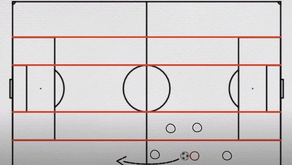 2.두번째로, 만약 리버풀이 거세게 압박하게되면, 상대팀은 하프스페이스지역 뒤로 패스할 수 밖에 없고, 상대선수는 터치라인을 등진 상태로 볼을 받는다. 그러면 그를 애워싸고 있는 선수들과 압박을 위해 다시 전진하는 선수들에게 취약할 수 있다. 리버풀은 영리하게 역습전술을 역이용한다. 윙어 또는 전진한 미드필더가 후퇴하면서 피보테나 여분의 미드필더에게 패스하거나, 그리고나면 공격국면에 맞추어져 강력한 수비블록을 구축하지 못한 상대팀을 공략할 수 있다.