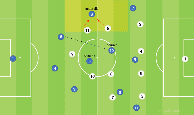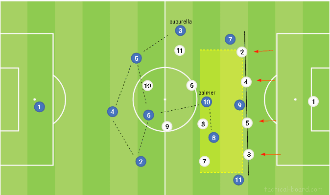 하지만 더 흥미로운 것은 선수들이 어떻게 로테이션 하는지에 있다. 형태는 거의 항상 동일하지만, 때때로 팔머가 볼을 받기위해 깊게 내려올 것이며, 혹은 쿠쿠렐라와 자리를 바꾸기도 할 것이다. 이로 인해 상대는 마크해야 할 선수를 끊임없이 바꿔야 할 필요가 있다. 즉 이러한 중앙 패스는 언제든 중앙을 직접 통과하거나 압박을 우회할 수 있지만, 어느 순간 상대에게 비수가 될 수 있는 패스를 지를 것이다.