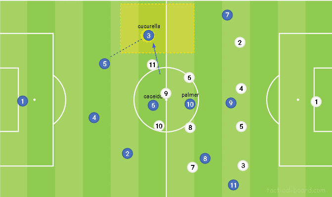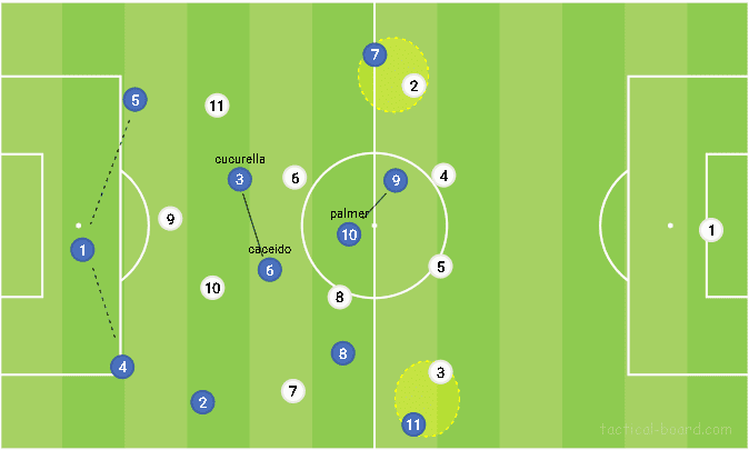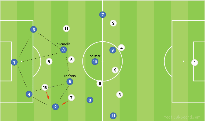 첫번째로, 우리가 흔히 보고있는 3-1-3-3 형태에 가깝게 변하고 있는데, 왼쪽의 쿠쿠렐라의 활용이 더 유동적이며, 팔머도 오른쪽 하프스페이스 혹은 중앙 공격형 롤를 맡는다. 하지만 두번째 주요 변화는 볼을 순환하는 구역에 있다. 이 구역에서 볼을 갖는데 의존하지 않고, 훨씬 더 깊은 포지션으로부터 볼을 인내심을 가지고 순환시킨다.