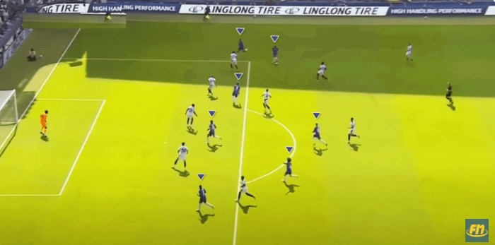 반대편 측면에서도 이와 같은 움직임을 볼 수 있다. 레버쿠젠 선수들이 압박을 위해 전진하다 트랩에 빠진다. 그들이 좀 더 측면에 치우치게 되면서, 중앙 채널 공간의 팔머에게 패스길을 허용했다. 그리고나서 팔머는 상대 위협 구역에서 파울을 얻는다.