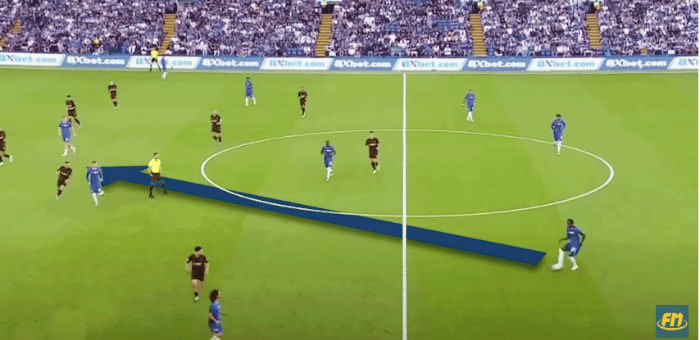여기서 첼시는 볼점유에 굉장한 인내심을 가질 것이다. 플레이는 좌우로 순환되며 진행될 것이고, 두 명의 와이드 미드필더들이 볼을 받기위해 이 공간으로 움직인다. 만약에 압박을 하지 않는다면, 측면 넓게 패스하여 하프 스페이스를 공략하거나, 만약 압박을 하면, 상대팀에게 더 큰 위협이 될 수 있다.