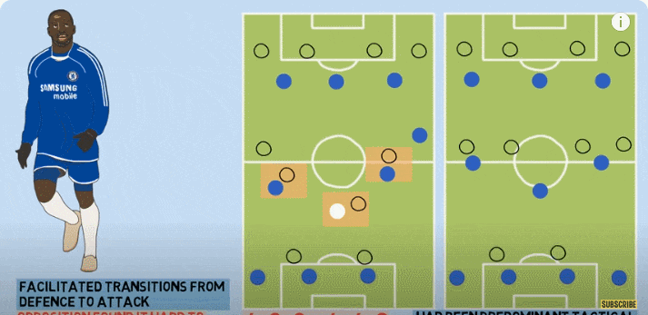 그리고 만약에 측면 미드필더가 3vs3을 만들기 위해 안 쪽으로 이동해온다면, 그 말 즉슨 풀백이 마크맨 없이 자유롭게 전진할 수 있었다는 의미였다. 이 포메이션은 수비에서 공격으로 전환하는데 용이했다. 왜냐하면 상대팀은 그들의 시스템을 4-3-3에 매칭되게 조정하는 것 없이 압박하는 것이 쉽지 않았고, 공격형 미드필더가 마케렐레를 마크할 수 있게 4-4-1-1 형태로 내려서면, 분명히 그들 자신의 공격 옵션 하나를 잃어버리게 되었다.